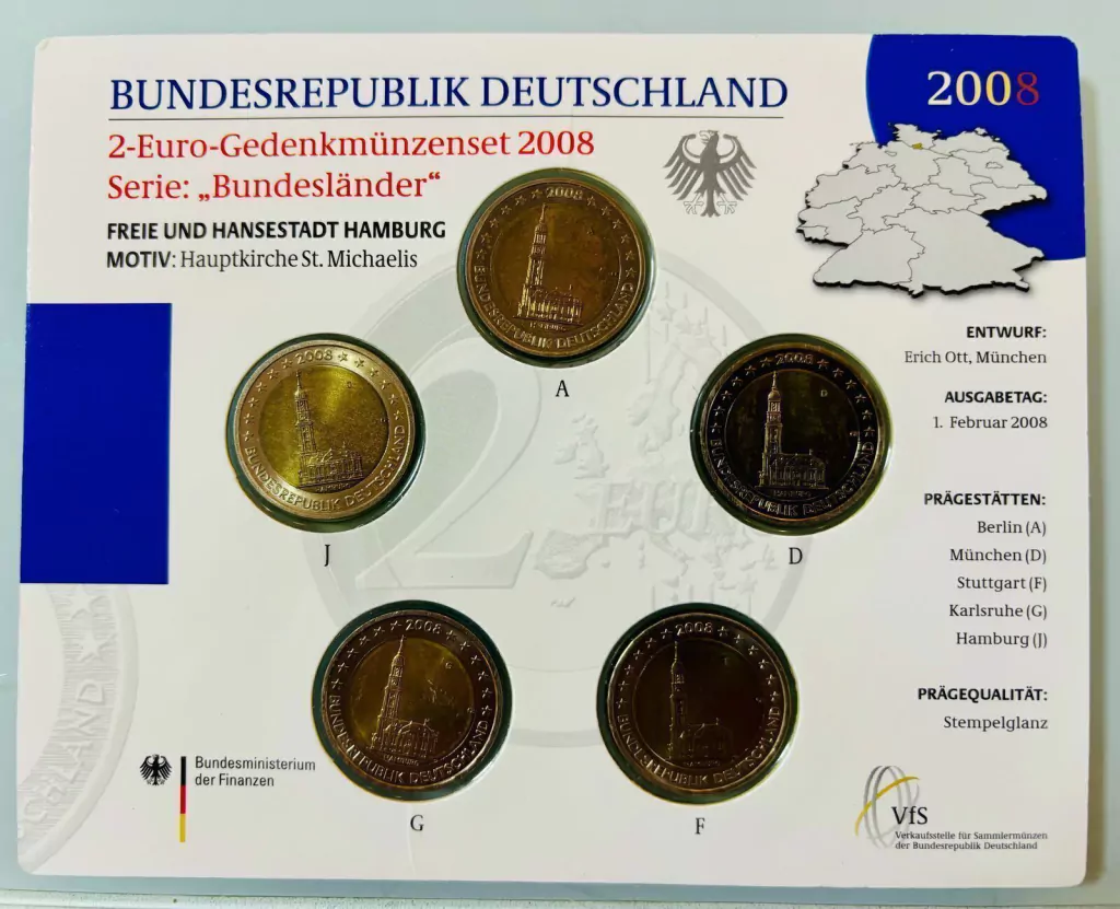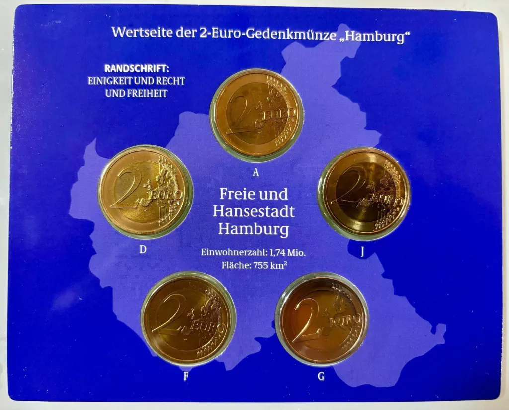 Blister com 5 Moedas no valor facial de 2 euros cunhadas nos seguintes lugares: