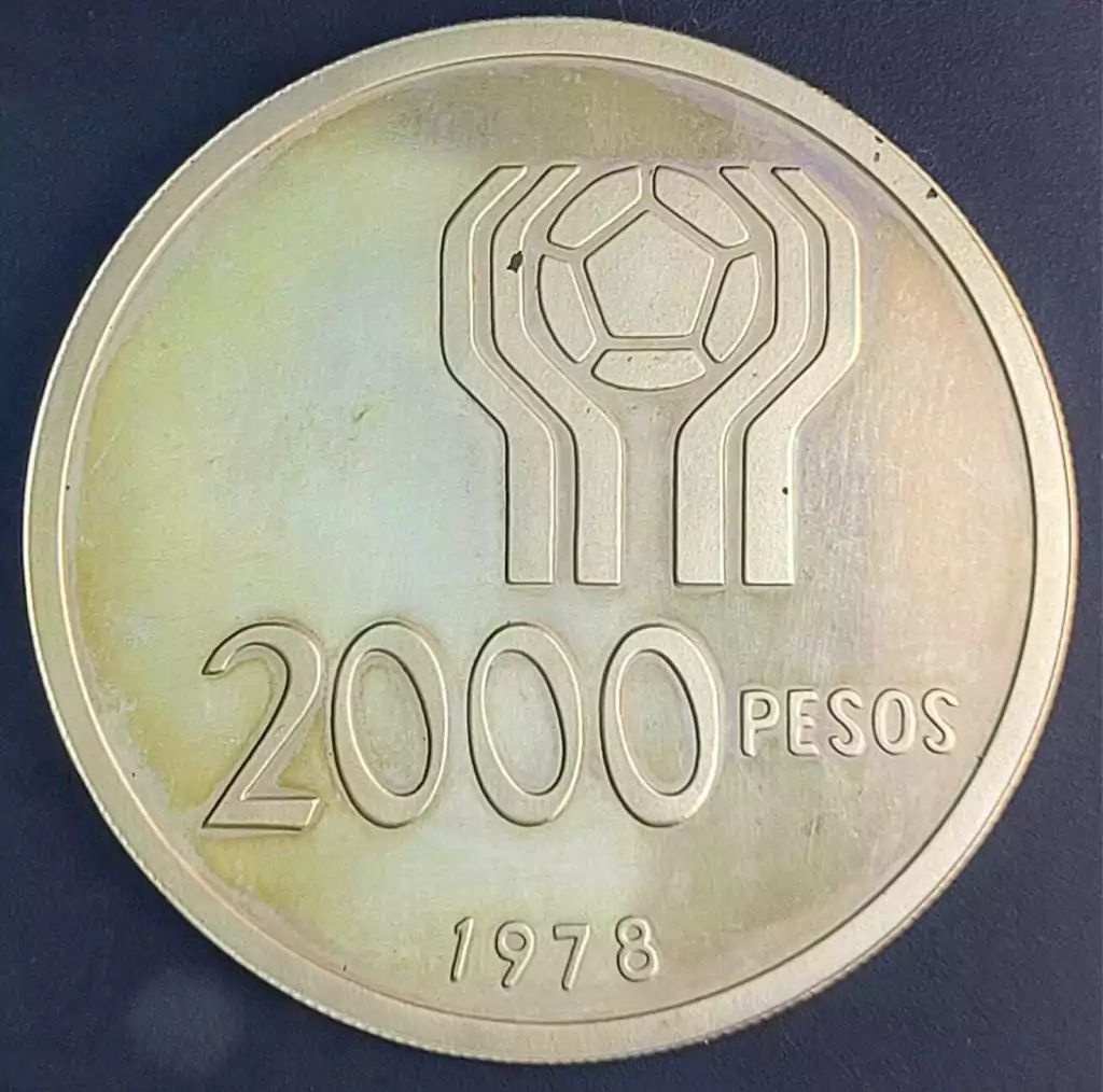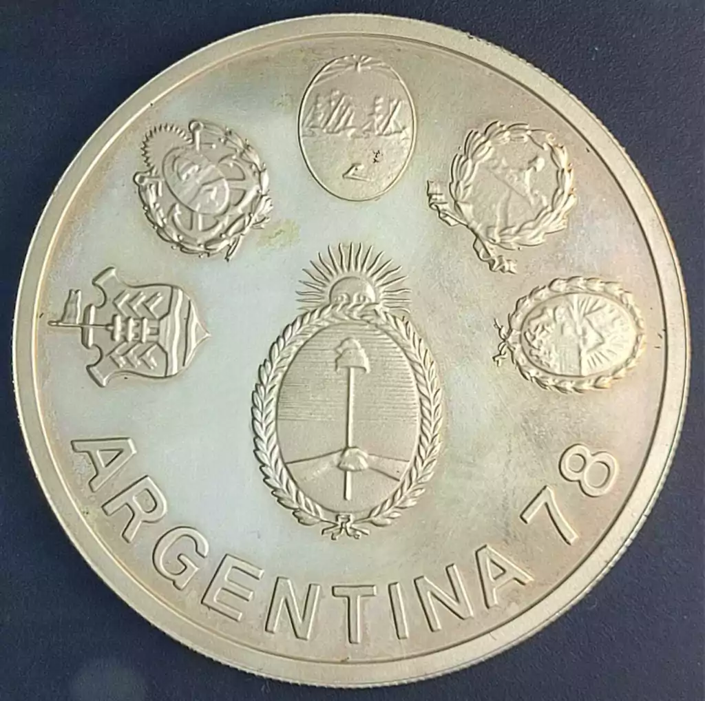 ANVERSO: No meio-campo, o Escudo Nacional; acima, em semicírculo, os escudos municipais de Córdoba, Mar del Plata, Buenos Aires, Mendoza e Rosário, sedes da Copa do Mundo disputada em 1978. A única cidade que designou dois estádios prontos para o evento foi Buenos Aires, que desenvolveu encontros no Club Atlético Vélez Sarsfield e no River.