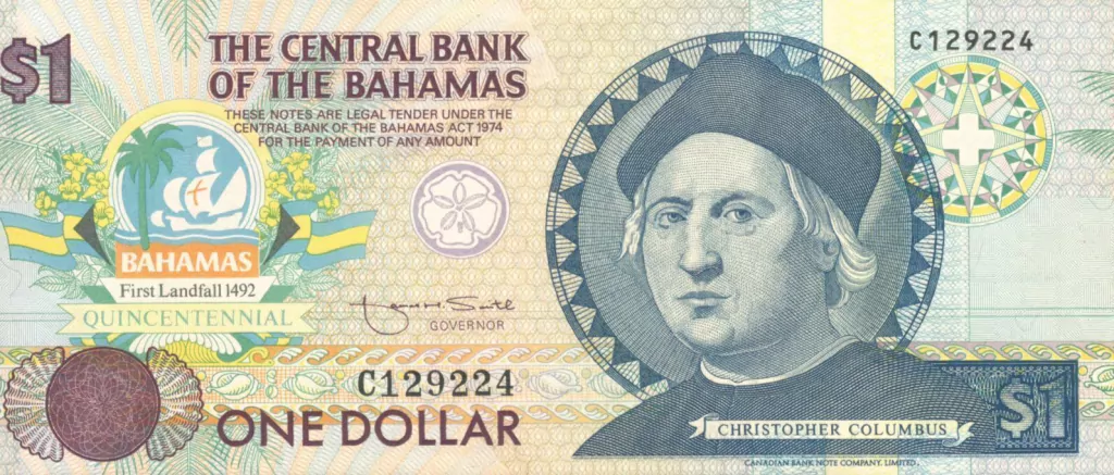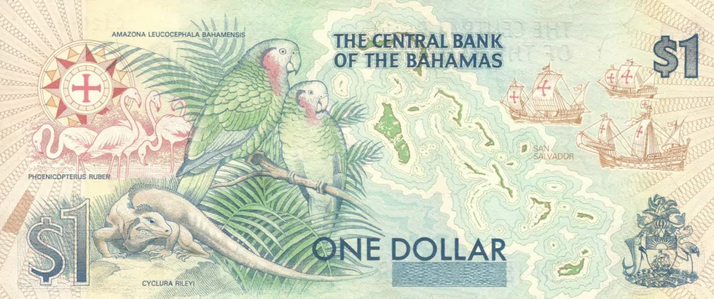 Três veleiros virados para a esquerda à direita. Brasão de armas das Baamas no canto inferior direito. Mapa das Baamas ao centro. Cinco flamingos americanos (Phoenicopterus ruber), dois papagaios cubanos (Amazona leucocephala bahamensis) e uma iguana de White Cay (Cyclura rileyi cristata) à esquerda.