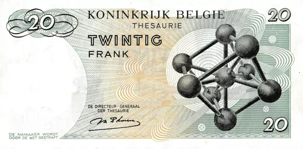 Retrato do Rei Baudouin I (Boudewijn) à esquerda, brasão de armas ao centro à direita.