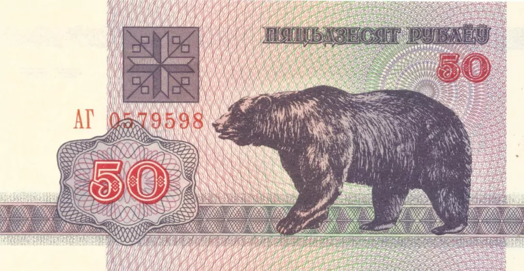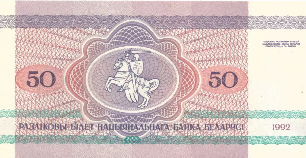 Guerreiro "Pahonia" a cavalo ao centro. O Pahonia é o brasão histórico do Grão-Ducado da Lituânia, mas foi também o emblema da República da Bielorrússia de 1991 a 1995.