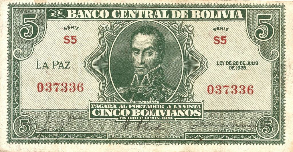 Brasão de armas da Bolívia no centro e o valor nos lados do emblema e em cada canto.