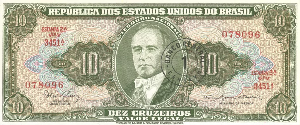 Carimbo redondo com a inscrição "BANCO CENTRAL - 1 CENTAVO" (overprinted).