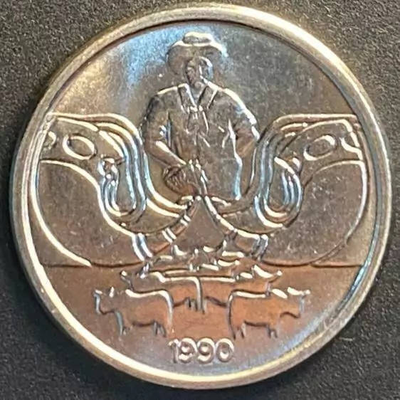 Pastor de gado a cavalo, à frente silhuetas de vacas, ano de emissão em baixo