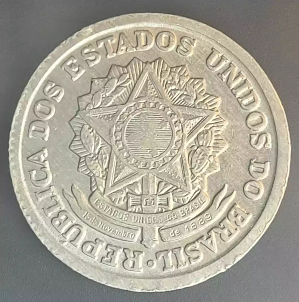 Emblema do Estado do Brasil (uma estrela com um círculo no interior, rodeada por 27 pequenas estrelas. Cruzeiro do Sul dentro de um círculo ladeado por tabaco e café)