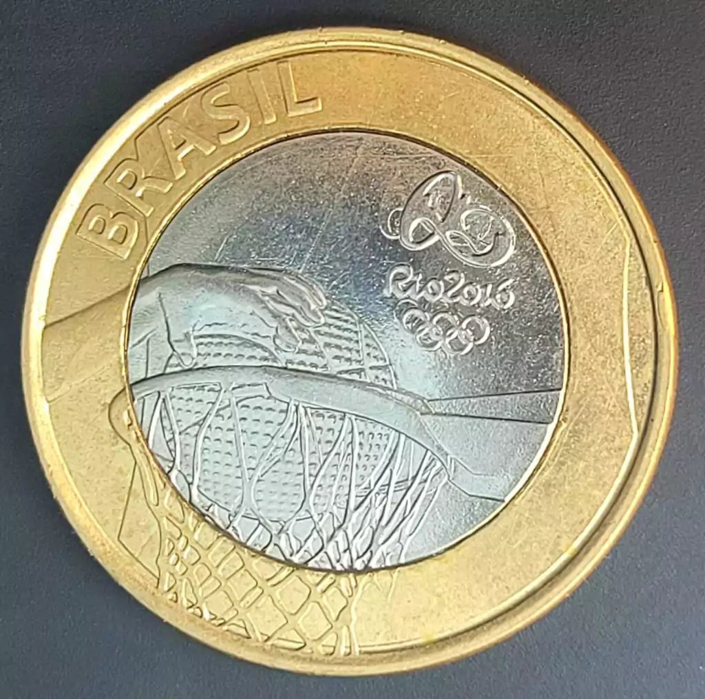Anverso: Bola no cesto com a mão (Com 6 Dedos), "BRASIL" à esquerda, logótipo dos Jogos do Rio à direita