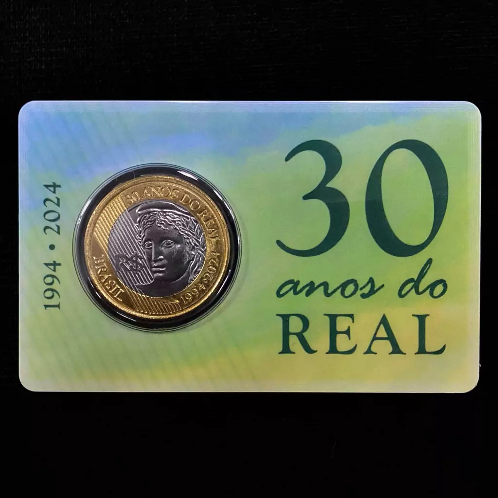 Cartão exclusivo da Casa da Moeda do Brasil com a versão comemorativa em homenagem aos 30 anos do Real, que entrou em circulação no meio circulante brasileiro em setembro de 2024. Com valor de face de R$1, a moeda possui a mesma dimensão e espessura de uma moeda convencional da mesma denominação. No reverso, podemos observar a constelação do Cruzeiro do Sul em alusão à Bandeira Nacional. Já no anverso, consta a Efígie da República e, na borda dourada, as legendas 30 Anos do Real, 1994-2024 e Brasil.