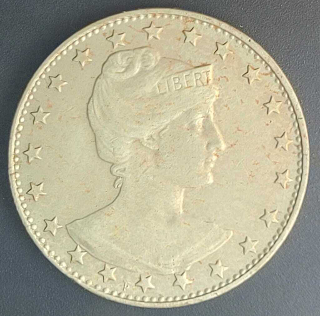 Busto da liberdade à direita, com um círculo de estrelas ao redor.