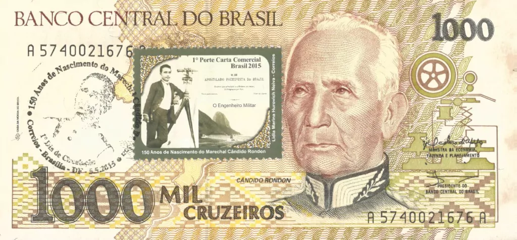 Retrato do Marechal Cândido Mariano da Silva Rondon (1865-1958), com uma gravura à esquerda mostrando uma estação telegráfica pioneira, além da representação de uma floresta e um mapa com contornos do Brasil e da América do Sul.
