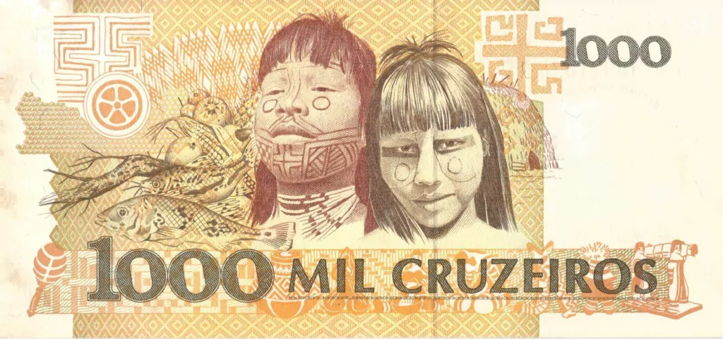 Casal de índios Carajás, ladeado pela representação de alimentos e uma habitação Nhambiquara.
