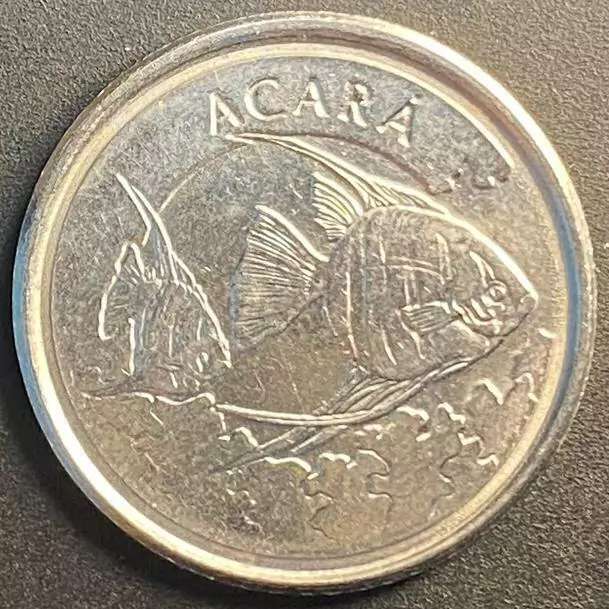 Dois peixes Acará (Pterophyllum) à direita. Letras acima.