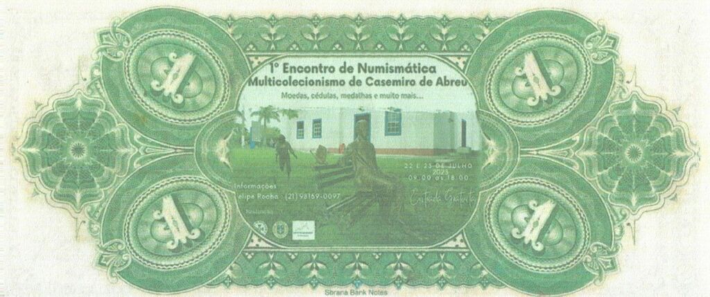 Trata-se de uma cédula comemorativa criada pela Rocha Numismática em homenagem ao 1° Encontro de Numismática e Multicolecionismo de Casimiro de Abreu. Esta é uma bela cédula que remete a um padrão artístico clássico do Brasil e que também homenageia um grande poeta brasileiro, Casimiro de Abreu. Cabe dizer que não se trata de uma cédula autêntica que tenha circulado no Brasil, sendo este apenas um produto comemorativo ao evento realizado.