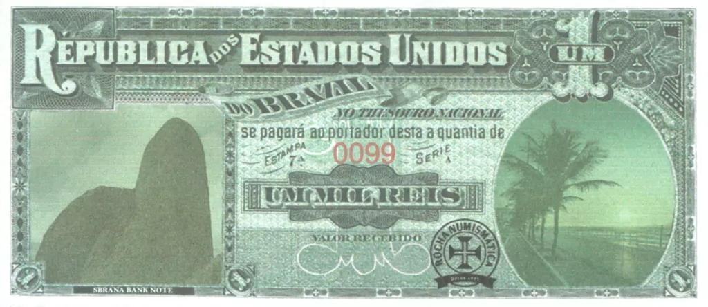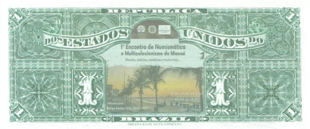 Trata-se de uma cédula comemorativa criada pela Rocha Numismática em homenagem ao 1° Encontro de Numismática e Multicolecionismo em Macaé, trata-se de uma bela cédula que remete a um padrão artístico clássico do Brasil e que também homenageia o Pico do Frade. Cabe dizer que não se trata de uma cédula autêntica que tenha circulado no Brasil, sendo este apenas um produto comemorativo ao evento realizado.
