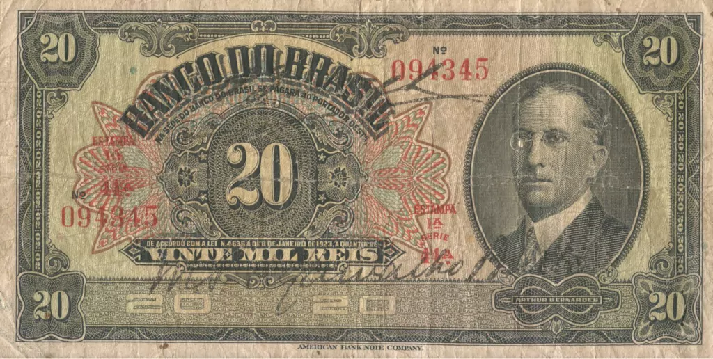20 na esquerda do centro; à direita do centro medalhão com retrato de Arthur da Silva Bernardes, 12º Presidente do Brasil, 1922 a 1926.