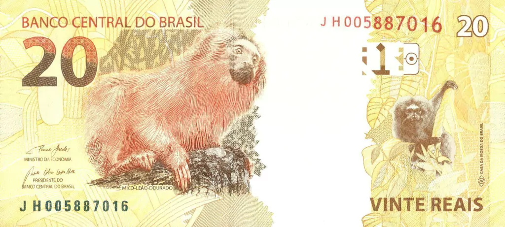 Um mico-leão-dourado (Leontopithecus rosalia) apoiado num tronco de árvore, ao lado da imagem de um mico-leão-dourado na floresta.