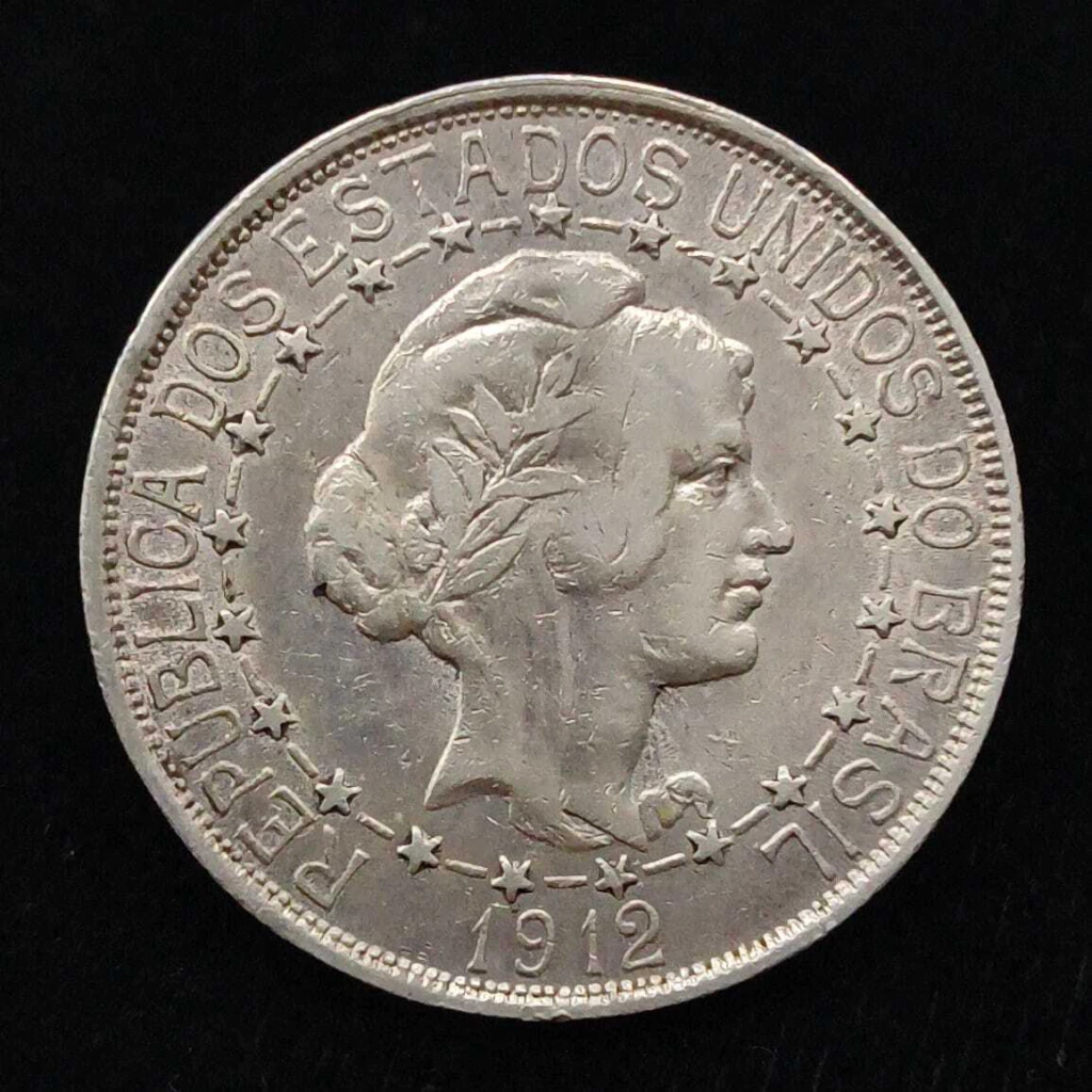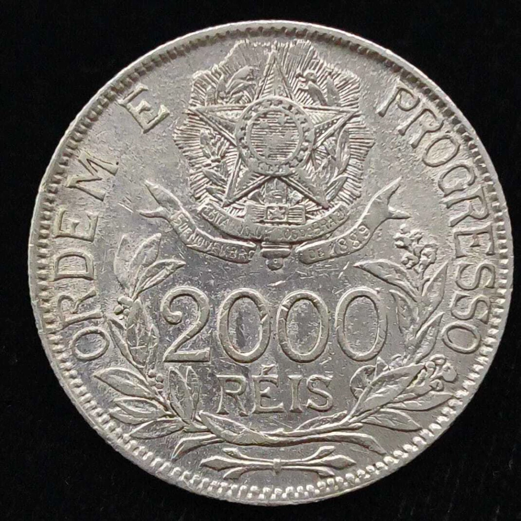 Reverso: Denominação dentro de uma coroa de flores. Armas nacionais por cima. Legenda dividida.