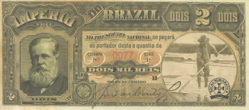 Trata-se de uma cédula comemorativa criada pela Rocha Numismática em homenagem ao 1° Encontro de Numismática e Multicolecionismo em Cabo Frio, trata-se de uma bela cédula que remete a um padrão artístico clássico do Brasil e que também homenageia Dom Pedro II. Cabe dizer que não se trata de uma cédula autêntica que tenha circulado no Brasil, sendo este apenas um produto comemorativo ao evento realizado.