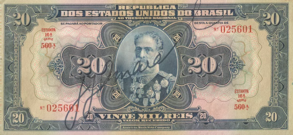 Anverso: Azul sobre policromia, em calcografia e litografia. Ao centro, retrato de Manuel Deodoro da Fonseca, 1º Presidente da República (1889-1891), ladeado por algarismos “20”.