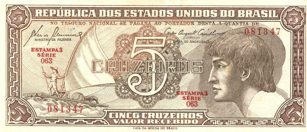 Esquerda: imagem de um balseiro em sua jangada navegando no mar. Ao centro: numeral 5 sobreposto pela palavra CRUZEIROS. Direita: perfil esquerdo de índio. Cor marrom.