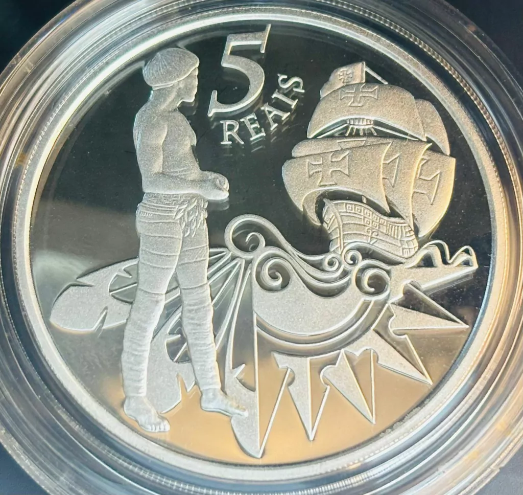 Reverso: Momento da descoberta, observado a partir da terra recém-descoberta. A composição de dois planos apresenta no primeiro, a figura de um índio, e no segundo a nau da expedição de Pedro Álvares Cabral rumo à nova terra. Ligando os elementos da cena, um adorno de pena de índio e uma rosa dos ventos.