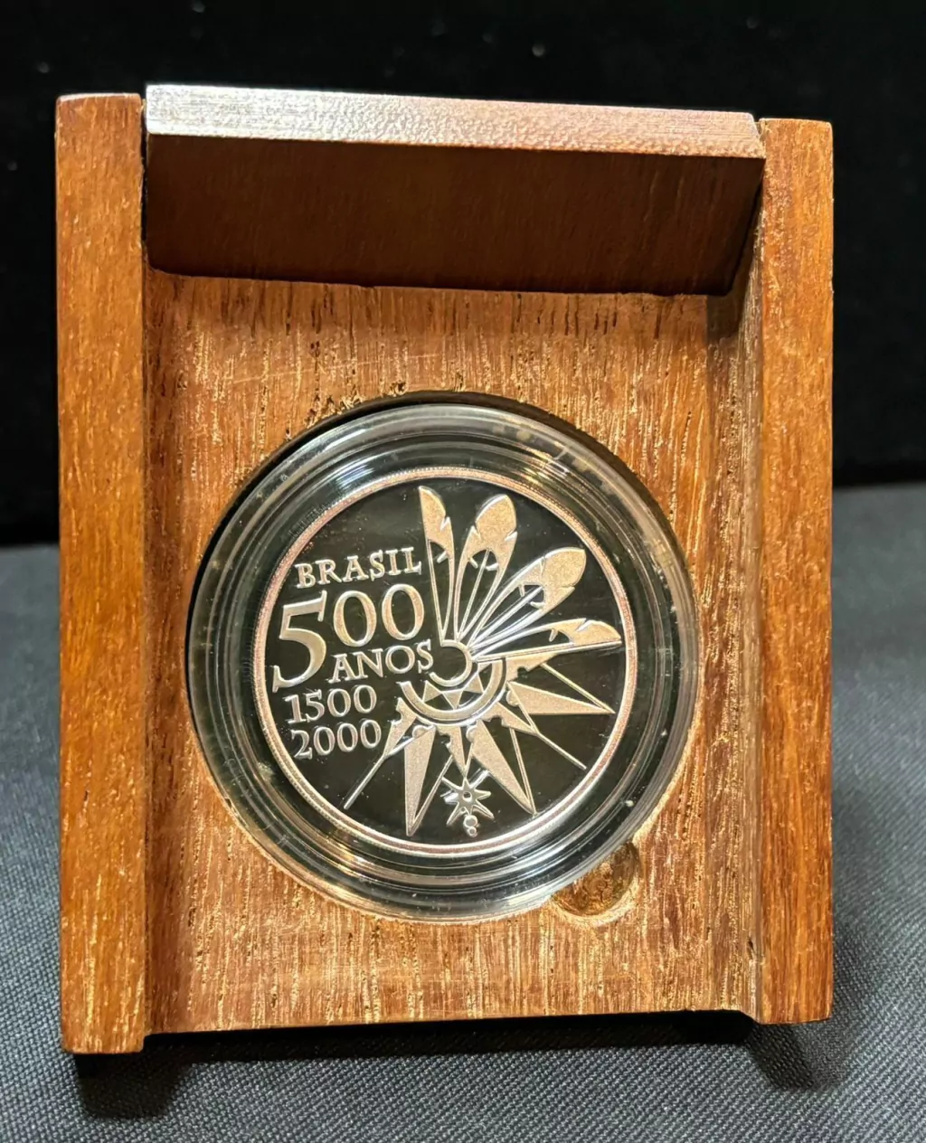 Anverso: Composição estilizada que retrata o encontro das culturas indígena e europeia através de adornos de penas caraterísticas dos índios brasileiros e de uma bússola, instrumento de navegação utilizado pelos portugueses durante o descobrimento.