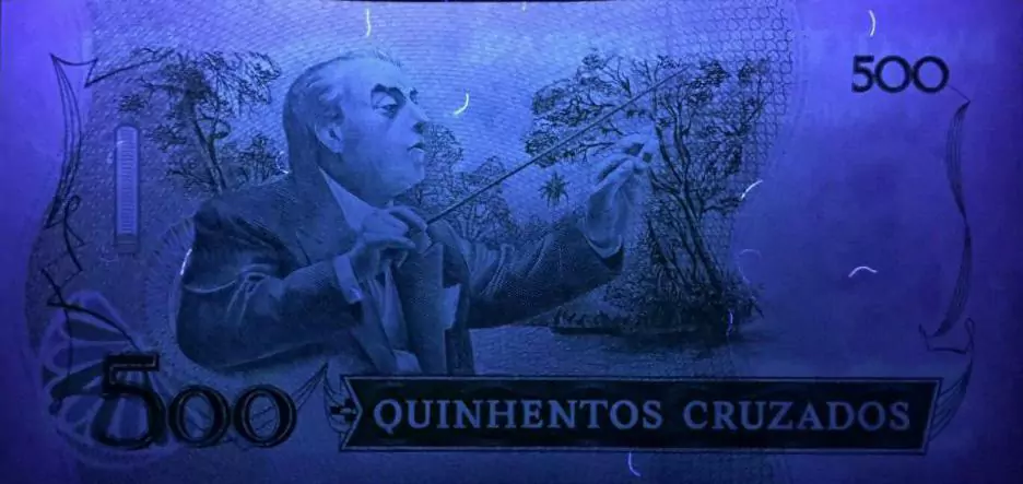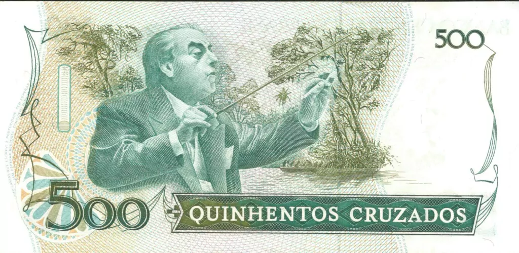 Reverso: Ao fundo, uma gravura baseada na obra de Johann Moritz Rugendas, representando uma floresta primitiva brasileira na margem de um rio, onde aparece uma canoa transportando pessoas. O conjunto de imagens é ladeado pela frase "Considero minhas obras como cartas que escrevi à posteridade sem esperar resposta", proferida pelo maestro, repetidamente escrita em duas linhas sobrepostas, cada uma para uma linha de cada lado.