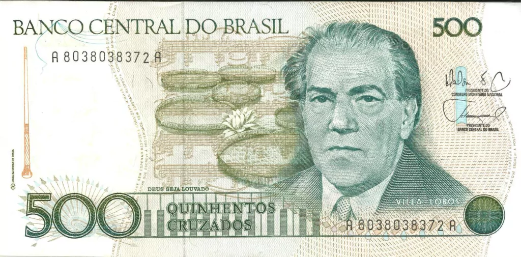 Anverso: Retrato de Heitor Villa-Lobos (1887-1959) ao teclado de um piano, com a esquerda representando uma Victoria amazonica em flor. Ao fundo, um trecho da partitura da obra "Uirapuru". O conjunto de imagens é ladeado pela frase "Considero minhas obras como cartas que escrevi à posteridade sem esperar resposta", proferida pelo maestro, repetidamente escrita em duas linhas sobrepostas, cada uma para uma linha de cada lado.