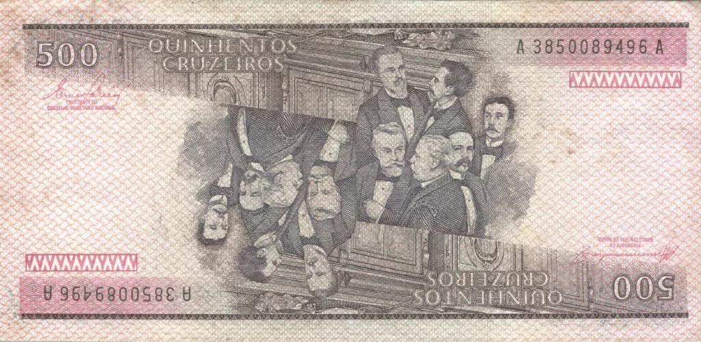 No centro, a representação pictórica de uma reunião de deputados referente à Proclamação da República.