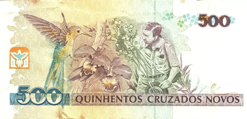 À direita, retrato do cientista Augusto Ruschi (1915-1986), ladeado por alegorias da flora e da fauna, destacando-se uma representação da Cattleya labiata warneri, orquídea que, com dezenas de variedades, é a mais típica do Espírito Santo e a maior flor do género no Brasil.