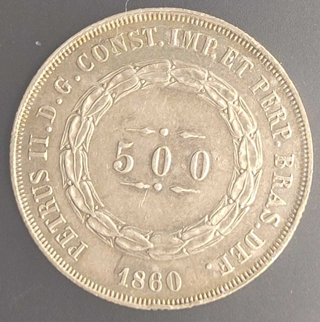 Reverso: Brasão de armas do Império do Brasil dentro de uma coroa de flores.