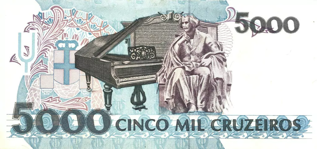 À direita, uma estátua de Carlos Gomes sentado que faz parte do monumento já referido no anverso e, à esquerda, um piano que pertenceu ao homenageado.