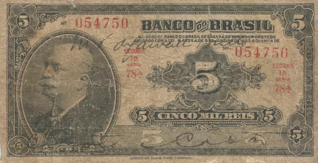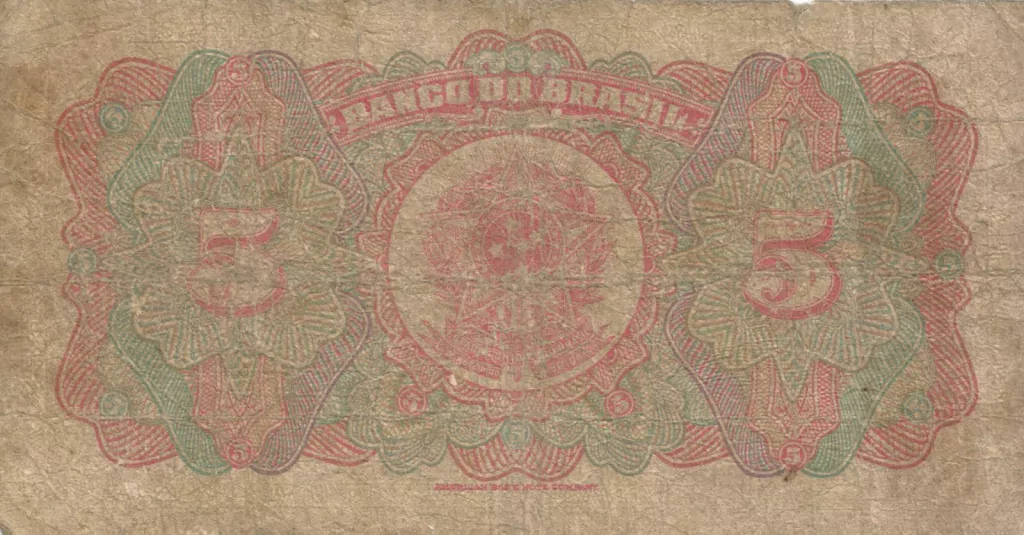 Ao centro, brasão da República dos Estados Unidos do Brasil, acompanhado em ambos os lados pelo algarismo arábico "5".