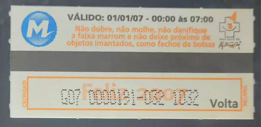 Bilhete de trem do primeiro dia do ano de 2007 da Metrô Rio, representando uma parte da história do sistema de transporte público da cidade. Em 2007, o Metrô Rio já facilitava o transporte diário de milhares de pessoas. Este bilhete é uma peça que preserva um momento do passado recente do metrô, oferecendo aos colecionadores uma recordação do transporte urbano carioca dessa época