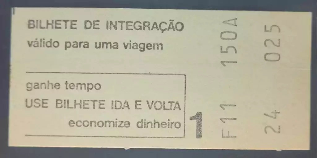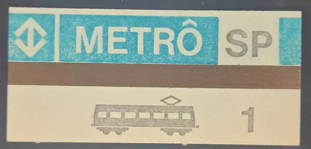 Antigo bilhete de integração da Linha 1 (azul) do Metrô de São Paulo, representando uma fase crucial no crescimento do sistema de transporte da cidade. Desde sua inauguração em 1974, a Linha 1 se tornou fundamental para a mobilidade urbana. Este bilhete é peça de memória do desenvolvimento do metrô e da modernização do transporte público em São Paulo.