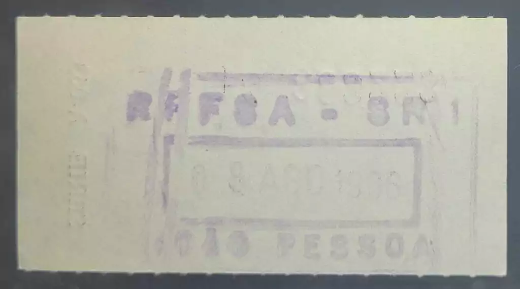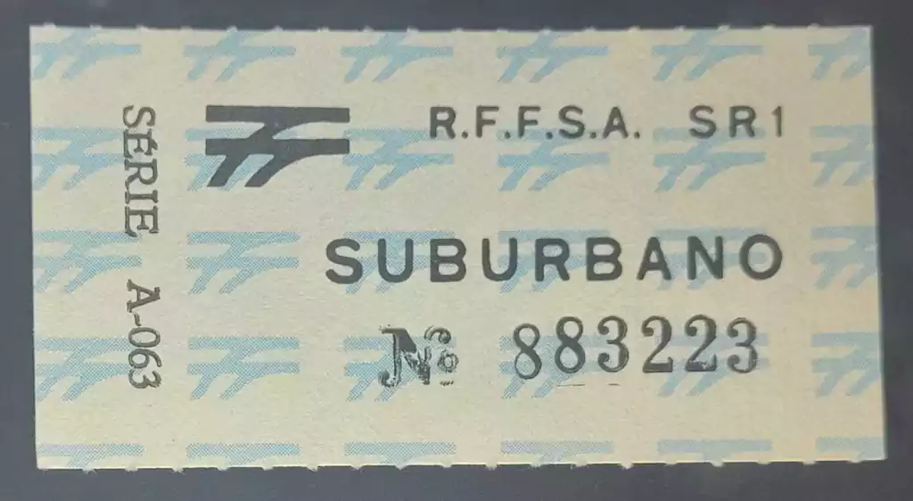 Bilhete suburbano de trem da Rede Ferroviária Federal S/A (R.F.F.S.A.), SR1, de João Pessoa, Paraíba, datado de 1996. Durante este período, a R.F.F.S.A. ainda era responsável pela operação de várias linhas ferroviárias no Brasil, incluindo o serviço suburbano em cidades como João Pessoa. Esse bilhete é um reflexo da história do transporte ferroviário no país, representando uma fase importante do sistema de trens no Nordeste e no Brasil como um todo. Um item colecionável que preserva a memória de um momento significativo no transporte público de João Pessoa.