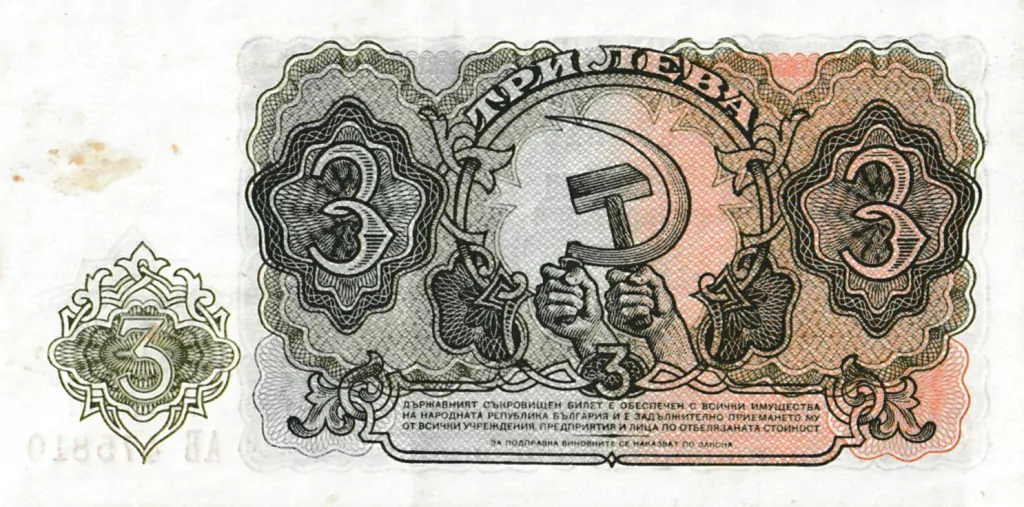 Disposição assimétrica, o brasão de armas à esquerda, o número "3" numa vinheta à direita, um escudo com a inscrição "НРБ" (República Popular da Bulgária) na margem branca mais larga, o número de série por baixo.