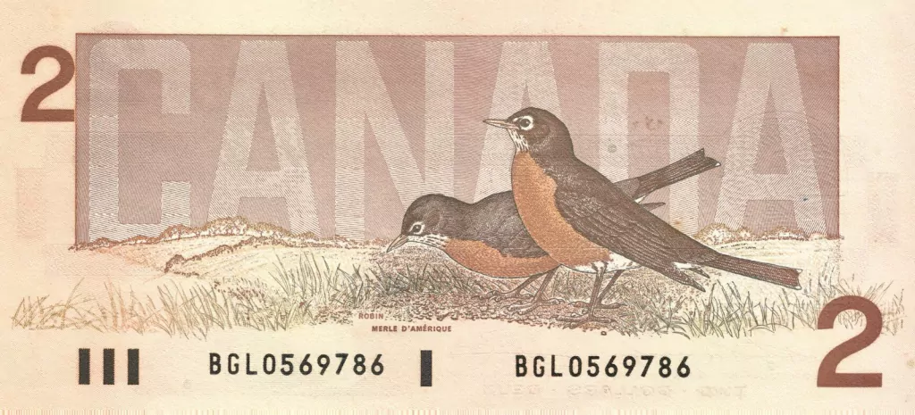 Reverso: Pintarroxos em campo de relva com a palavra “CANADA” ao fundo.