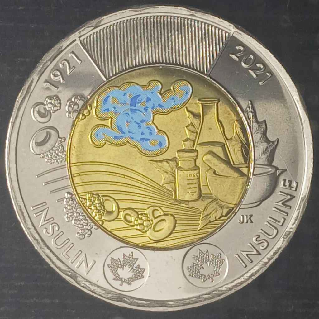 REVERSO: No centro do disco da moeda são exibidos ao fundo elementos de uma bancada farmacêutica, utilizados nos primórdios da formulação da insulina, tais como um frasco, um almofariz e um pilão e um frasco de Erlenmeyer, sobrepostos numa folha de ácer, bem como glóbulos vermelhos, glucose e moléculas de insulina coloridas. Na coroa circular externa da moeda, figuram as palavras INSULIN / INSULINE, respectivamente em inglês e francês, e os anos 1921 e 2021.