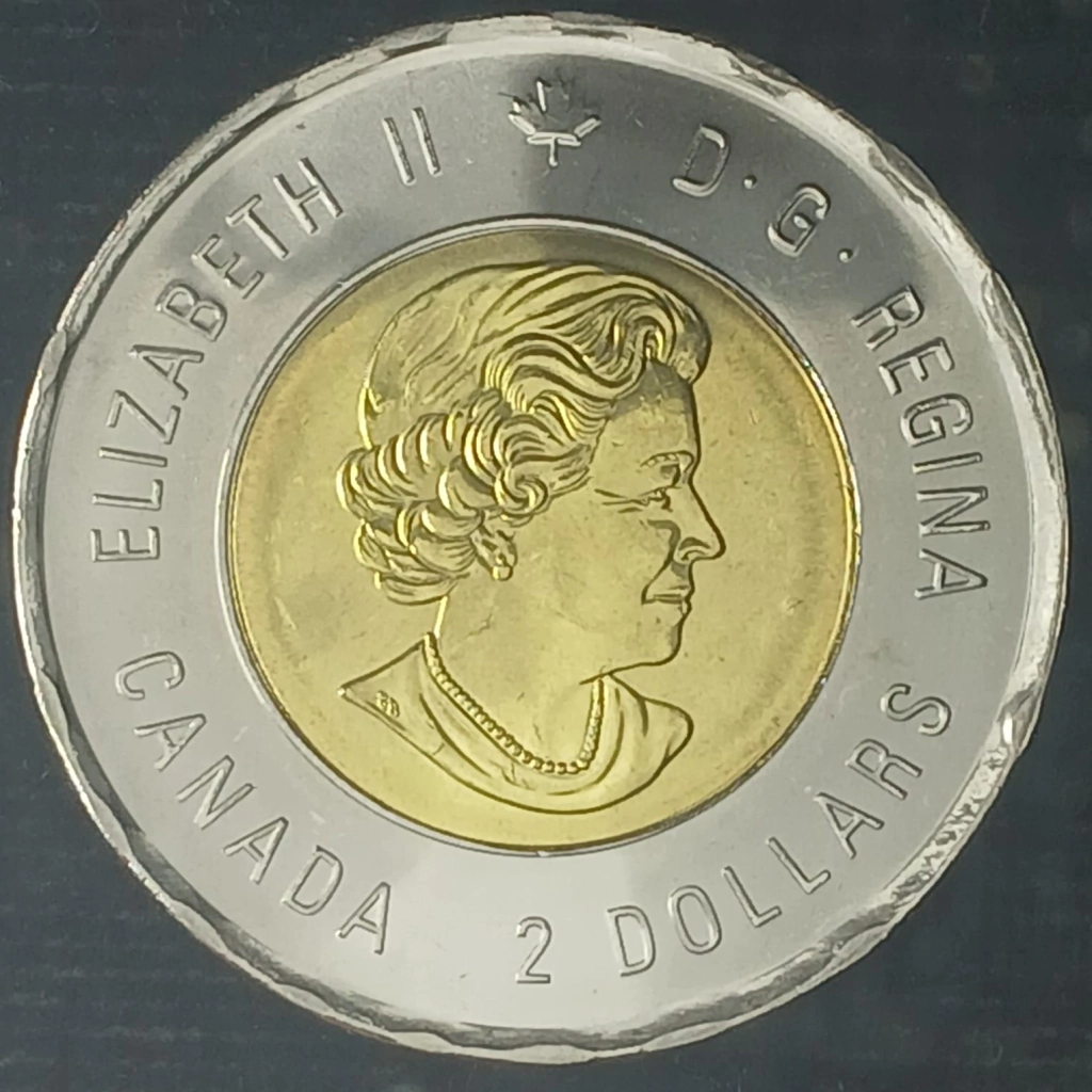 ANVERSO: No centro do disco - a efígie da rainha Elizabeth II. Ao longo do bordo - inscrições circulares, na parte superior: "Elizabeth II" seguida de uma folha de bordo, símbolo nacional canadense, e "D.G. REGINA", inscrição latina correspondente a "Por Graça de Deus, Rainha"; na parte inferior: "Canada" seguido do valor "2 Dollars"