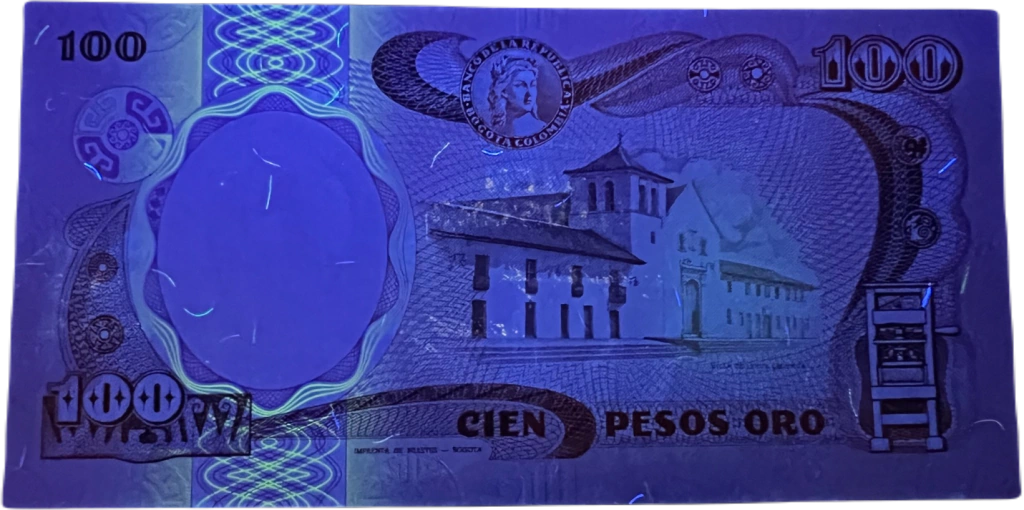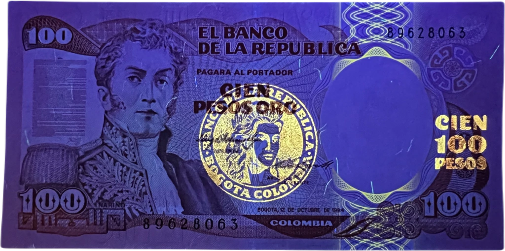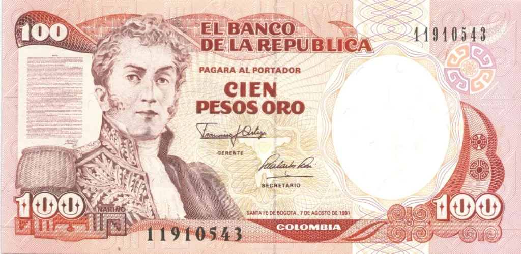 General Antonio Nariño à esquerda, condor à direita. Cor: violeta, castanho, laranja e vermelho escuro sobre fundo multicolorido