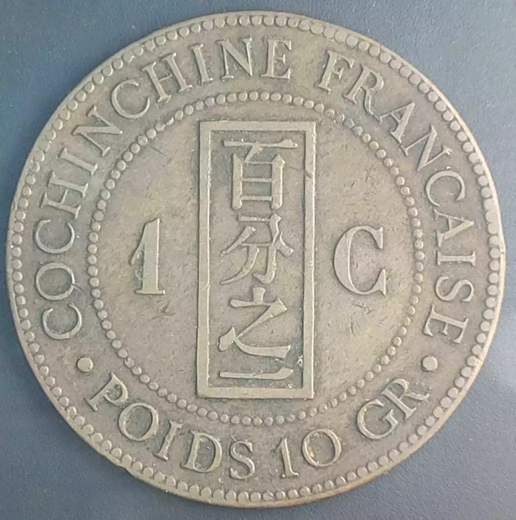 Esta moeda foi emitida durante o período colonial francês na Cochinchina e apresenta inscrições em latim e chinês, refletindo a diversidade cultural e a influência europeia na região.