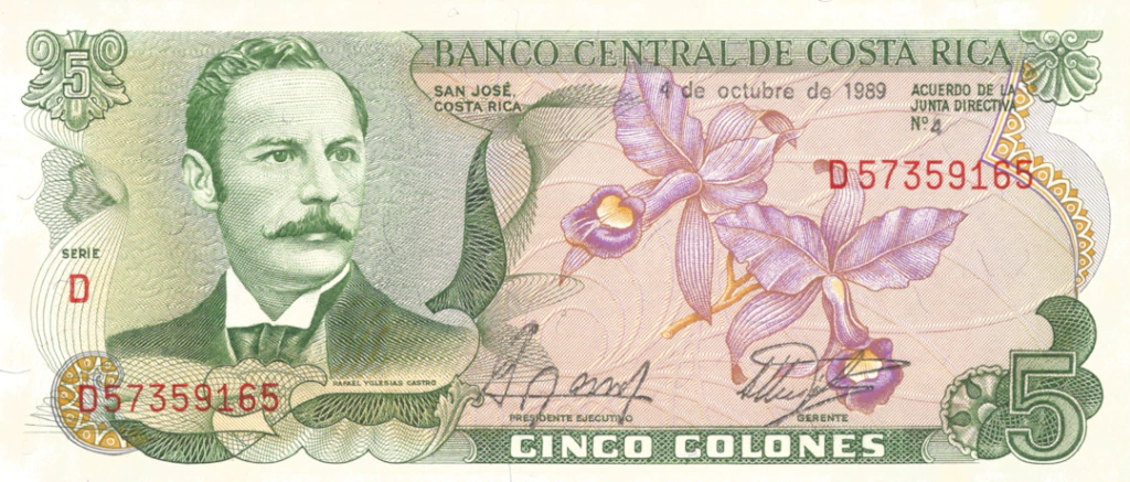 Impressão traseira verde com área de flor roxa laranja. Retrato de Rafael Yglesias Castro à direita, à esquerda a flor nacional da Costa Rica, a Orquídea Páscoa (SP: Guaria Morada) (LT: Guarianthe skinneri)