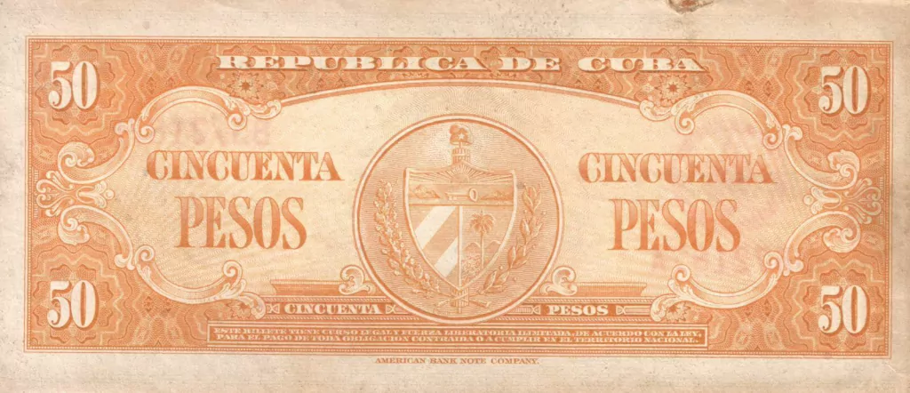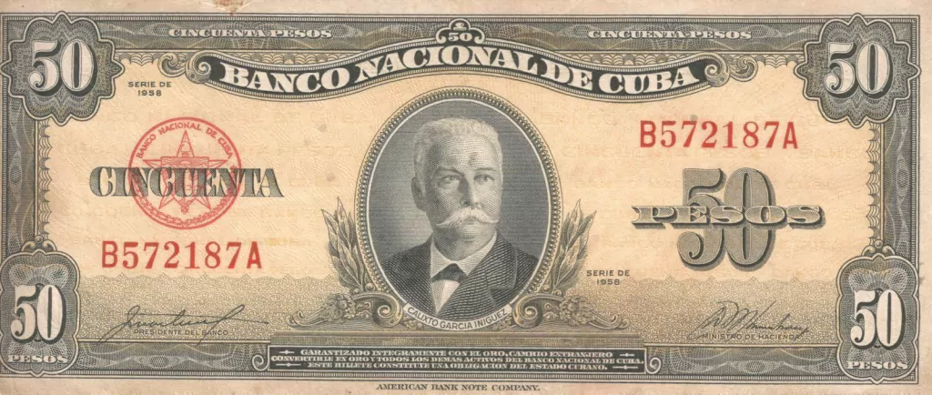 Anverso: Retrato de Calixto Garcia Iñiguez em moldura oval, no centro. Cor: preto e amarelo. Número de série: vermelho (1950 e 1958). À esquerda, selo vermelho do Banco Nacional de Cuba.