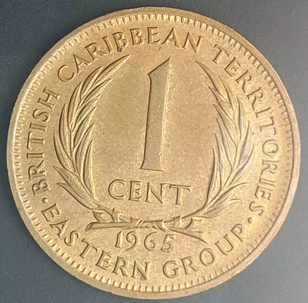 Reverso: Valor “1 CENT” ladeado por folhas de palmeira, com as inscrições “BRITISH CARIBBEAN TERRITORIES” acima e “EASTERN GROUP” abaixo, juntamente com o ano de cunhagem.
