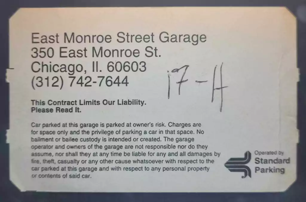 Ticket de estacionamento (5.50 dólares) da Standard Parking para a (350) East Monroe Street Garage, em Chicago, com selo da Chicago Park District. Parte do sistema de estacionamento do Grant Park, essa garagem atende visitantes de marcos importantes da cidade, como o Millennium Park e o Art Institute of Chicago. Um documento do passado recente, preservando um aspecto da vida cotidiana em uma das metrópoles mais icônicas dos Estados Unidos.
