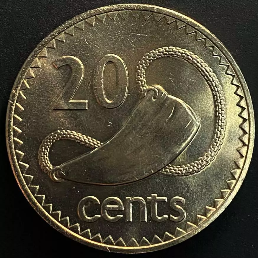 Reverso: Tabua (dente de cachalote polido, importante nos rituais tradicionais das Fiji) rodeado pela denominação