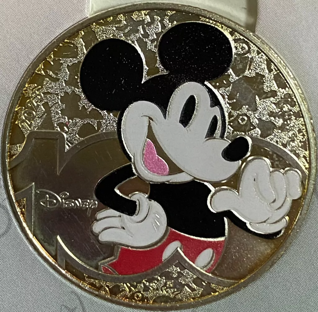 Reverso: Mickey colorido em primeiro plano, com o número “100” e a palavra “DISNEY” ao fundo e diversos personagens do mundo Disney.