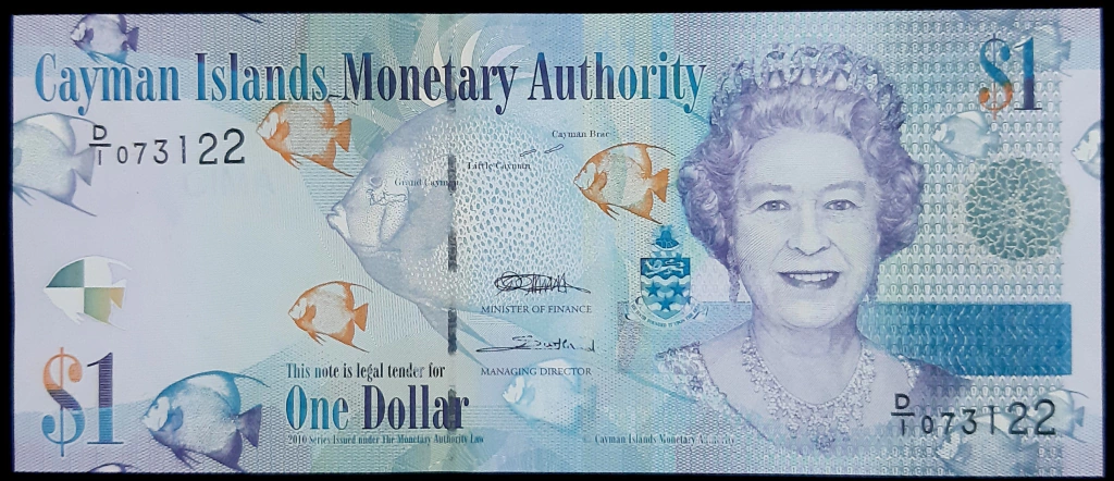 Azul sobre fundo multicolorido. Imagem do Bluff em Cayman Brac, concha à esquerda, peixe à direita, denominações nos cantos opostos
