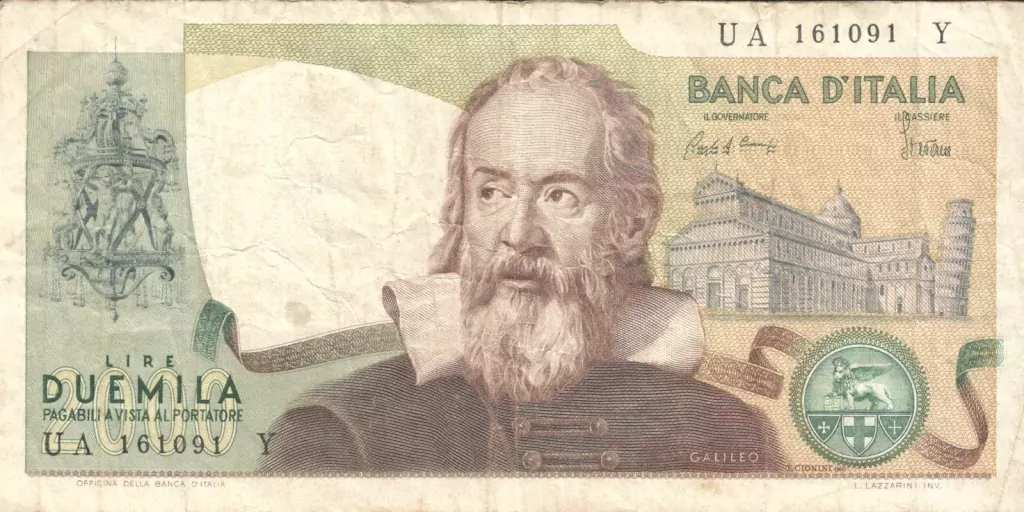 Anverso: Galileo ao centro, Catedral de Pisa com a Torre Inclinada à direita.