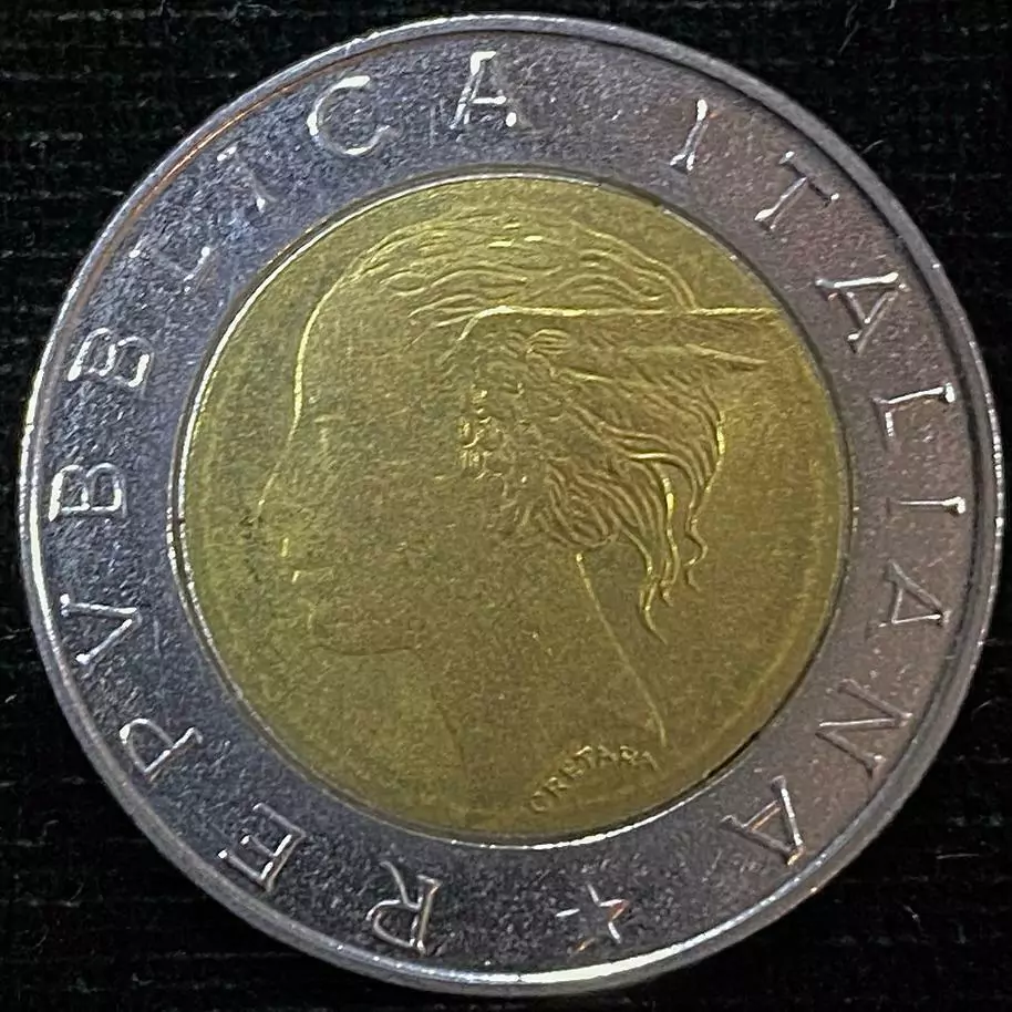 Anverso: Cabeça feminina representando a República Italiana, voltada para a esquerda, com asas estilizadas simbolizando inteligência e liberdade. Inscrição “REPVBBLICA ITALIANA” ao redor e o nome da gravadora, Laura Cretara, abaixo do corte do pescoço.